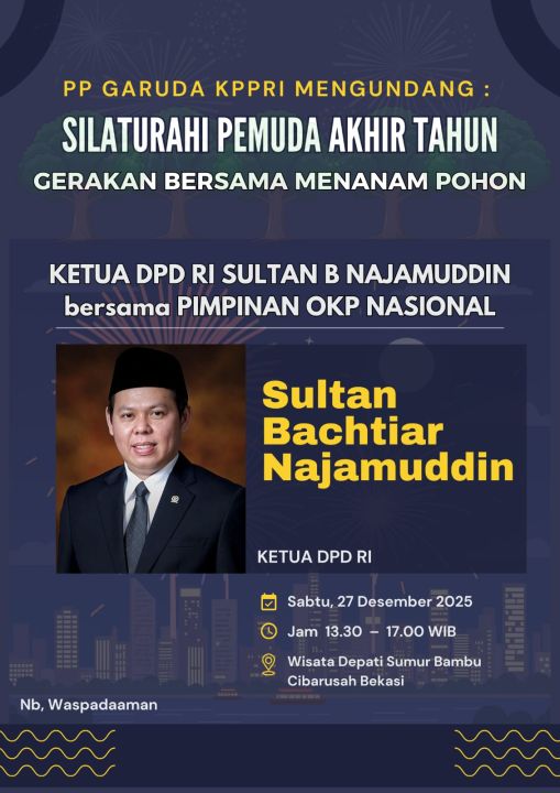 Refleksi Diri dalam menyongsong Tahun Baru 2026 dengan semangat baru, PP Garuda KPP RI, Sebagai salah satu Organisasi Kepemudaan tingkat nasional yang terus berupaya melahirkan kepemimpinan yang memiliki karakter kebangsaan yang kuat dan berdaya saing, pada Sabtu 27 Desember 2025 akan menggelar “Silaturahmi Pemuda Akhir Tahun”, Bersama Tokoh Nasional, Ketua DPD-RI, Sultan Bachtiar Najamudin. Acara yang digelar di Kawasan Wisata Depati Sumur Bambu, Cibarusah Bekasi tersebut juga akan dilakukan “Gerakan Bersama Menanam Pohon”.
