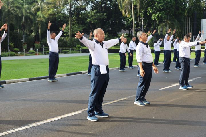 Untuk menjaga kesehatan dan kebugaran Prajurit, Komandan Sekolah Staf dan Komando Angkatan Laut (Danseskoal), Laksamana Muda TNI Ariantyo Condrowibowo bersama seluruh Prajurit dan Pegawai Negeri Sipil (PNS) Seskoal melaksanakan olah raga di Lapangan Apel Laut Jawa Seskoal, Cipulir, Kebayoran Lama, Jakarta Selatan. Selasa (1/7/2025).