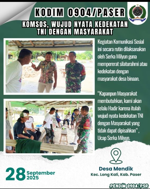Kodim 0904/Psr, Korem 091/ASN, Kodam VI/Mlw – Pada hari Minggu Tanggal 28 September 2025 Babinsa Mendik Serka Milyun Melaksanakan Kegiatan Komunikasi Sosial (Komsos) bertempat di Wilayah Binaannya Desa Mendik, Kec. Long Kali, Kab. Paser, Minggu (28/09/25).