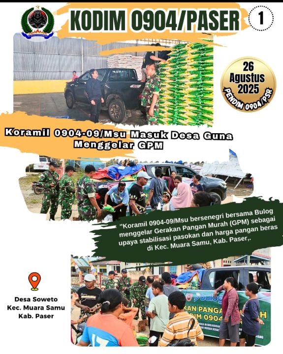 Kodim 0904/Paser, Korem 091/ASN, Kodam VI/Mlw – Koramil 0904-09/Msu bersenegri bersama Bulog menggelar Gerakan Pangan Murah (GPM) sebagai upaya stabilisasi pasokan dan harga pangan beras di Kec. Muara Samu, Kab. Paser, Selasa (26/8/2025)