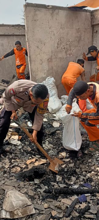Di bawah terik matahari, aparat kepolisian dan warga bahu membahu membersihkan sisa-sisa puing kebakaran yang sempat melanda blok hunian tersebut beberapa waktu lalu.
