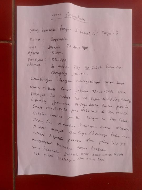 “Kami sudah melakukan pengecekan dan berkoordinasi langsung dengan pihak keluarga. Kami juga menyarankan dilakukan visum dan autopsi di RS Polri Kramat Jati untuk kepentingan penyelidikan, namun pihak keluarga menolak dan menyatakan tidak akan menuntut secara hukum atas kejadian ini. Mereka telah membuat surat dan video pernyataan resmi,” ujar Kompol Rohmad.