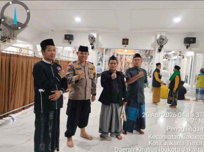 Jakarta – Suasana Minggu (26/04) dini hari di Masjid Jami Al Ikhlas, Penggilingan, Cakung, Jakarta Timur terasa hangat oleh kebersamaan ketika aparat kepolisian dan masyarakat berdiri dalam satu saf melaksanakan sholat subuh berjamaah, dilanjutkan dengan dzikir dan silaturahmi.